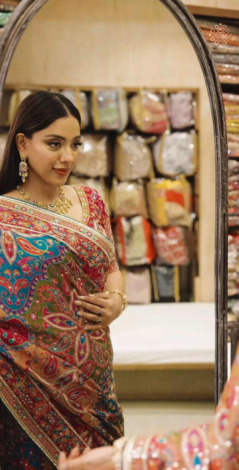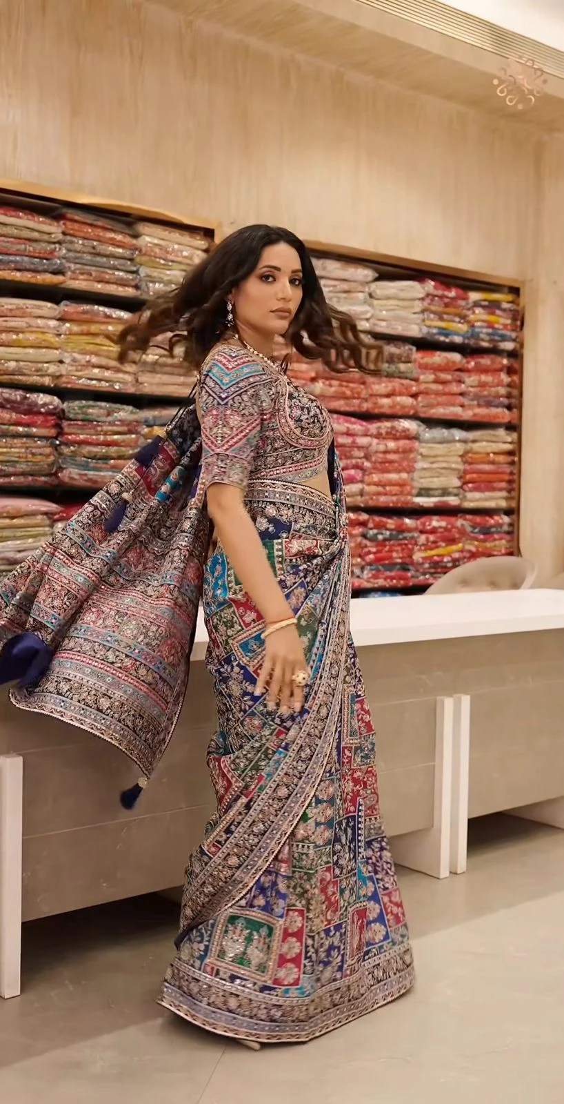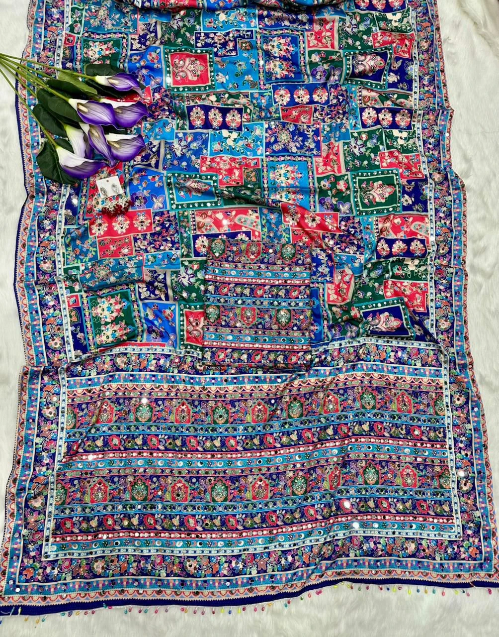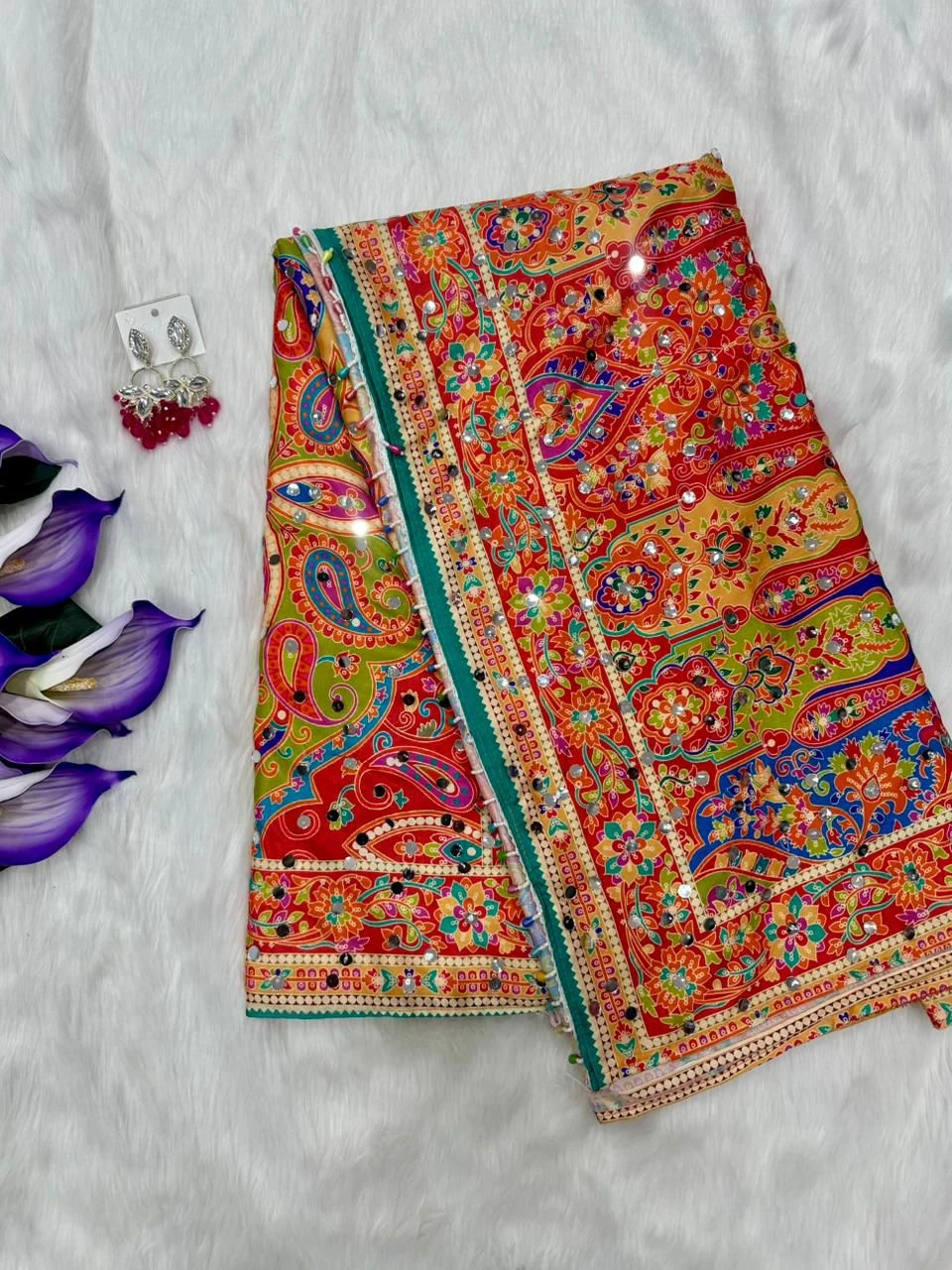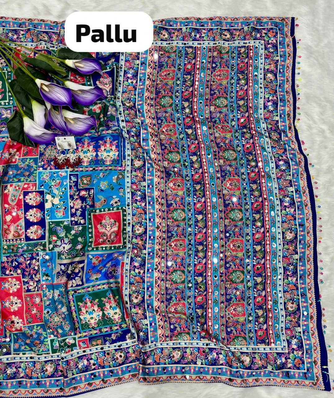 Upgrade your ethnic wardrobe with this beautiful designer saree made from premium crepe silk fabric. The saree features elegant digital prints all over with stunning real mirror work that adds a rich and stylish look. The attractive latkan border on the pallu enhances the overall beauty of the saree, making it perfect for festive occasions, parties, weddings and traditional events.