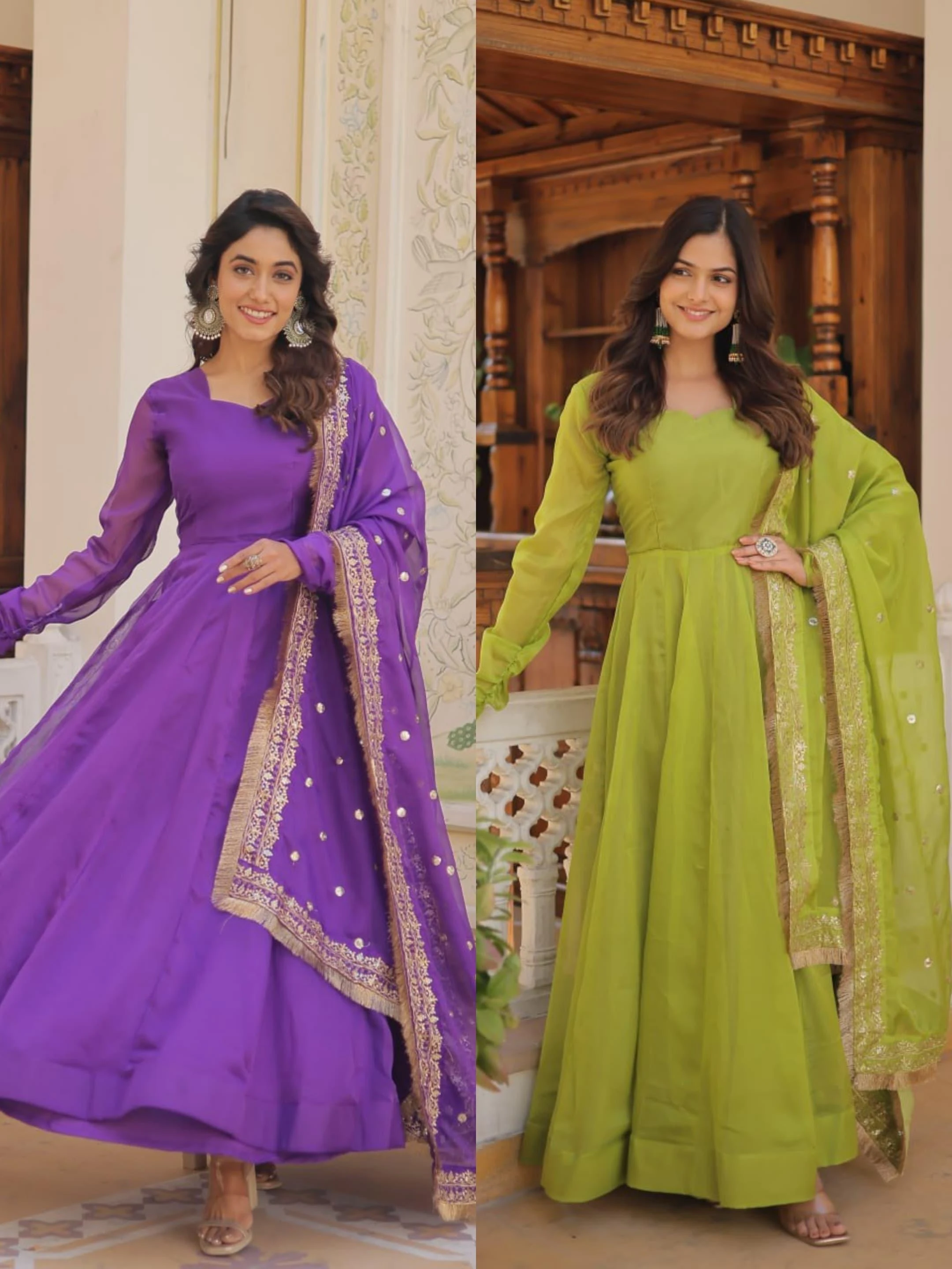 Available in beautiful Parrot Green and Purple colors, this ready-to-wear gown is ideal for women who want a stylish yet traditional outfit.
