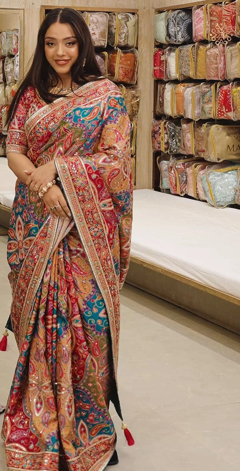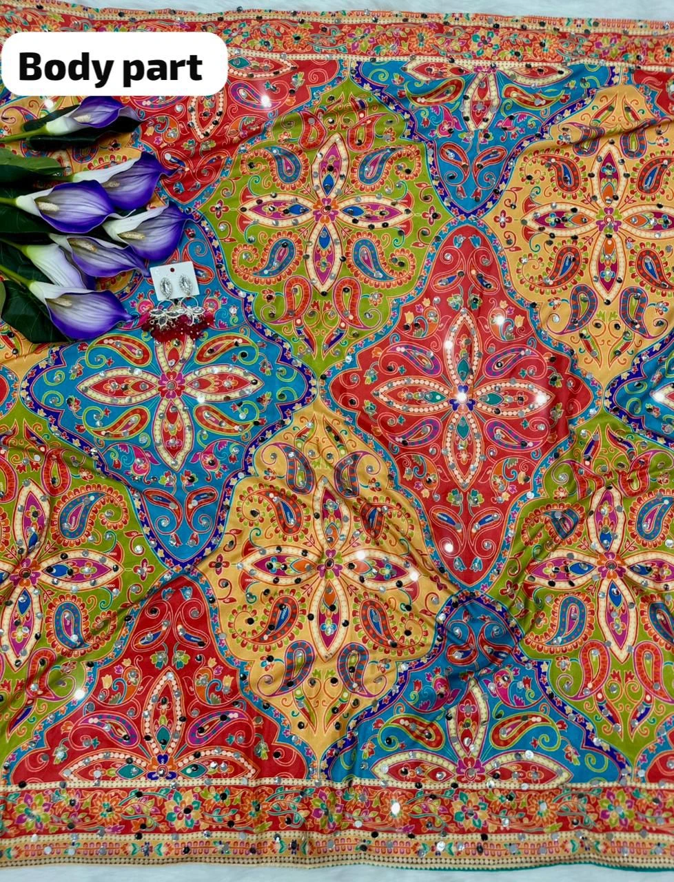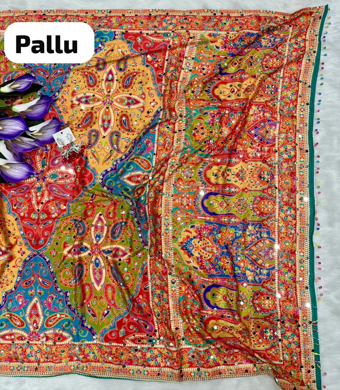 Upgrade your ethnic wardrobe with this beautiful designer saree made from premium crepe silk fabric. The saree features elegant digital prints all over with stunning real mirror work that adds a rich and stylish look. The attractive latkan border on the pallu enhances the overall beauty of the saree, making it perfect for festive occasions, parties, weddings and traditional events.
