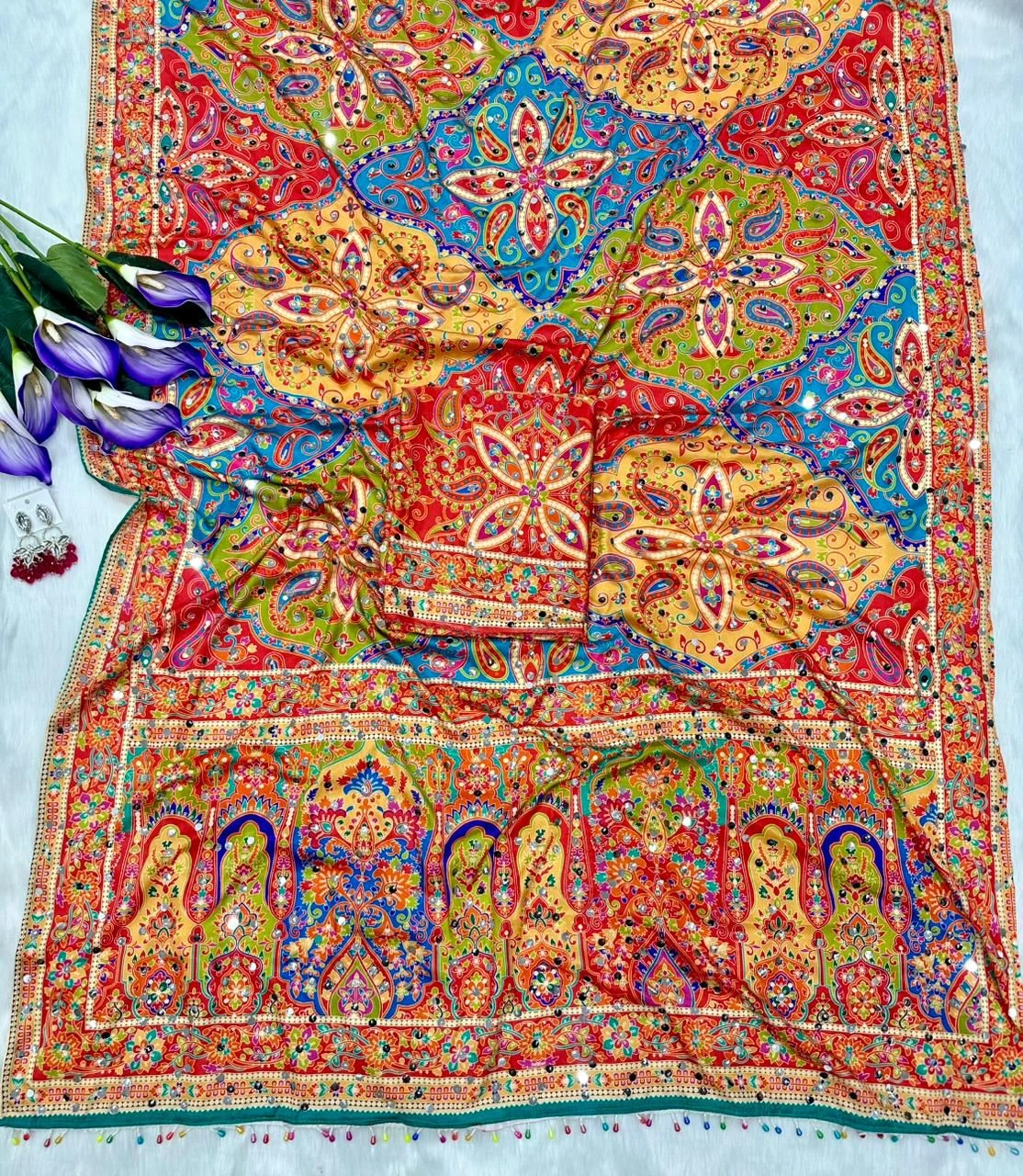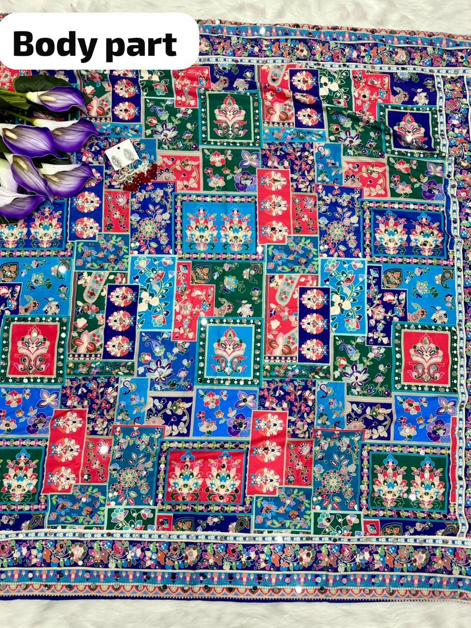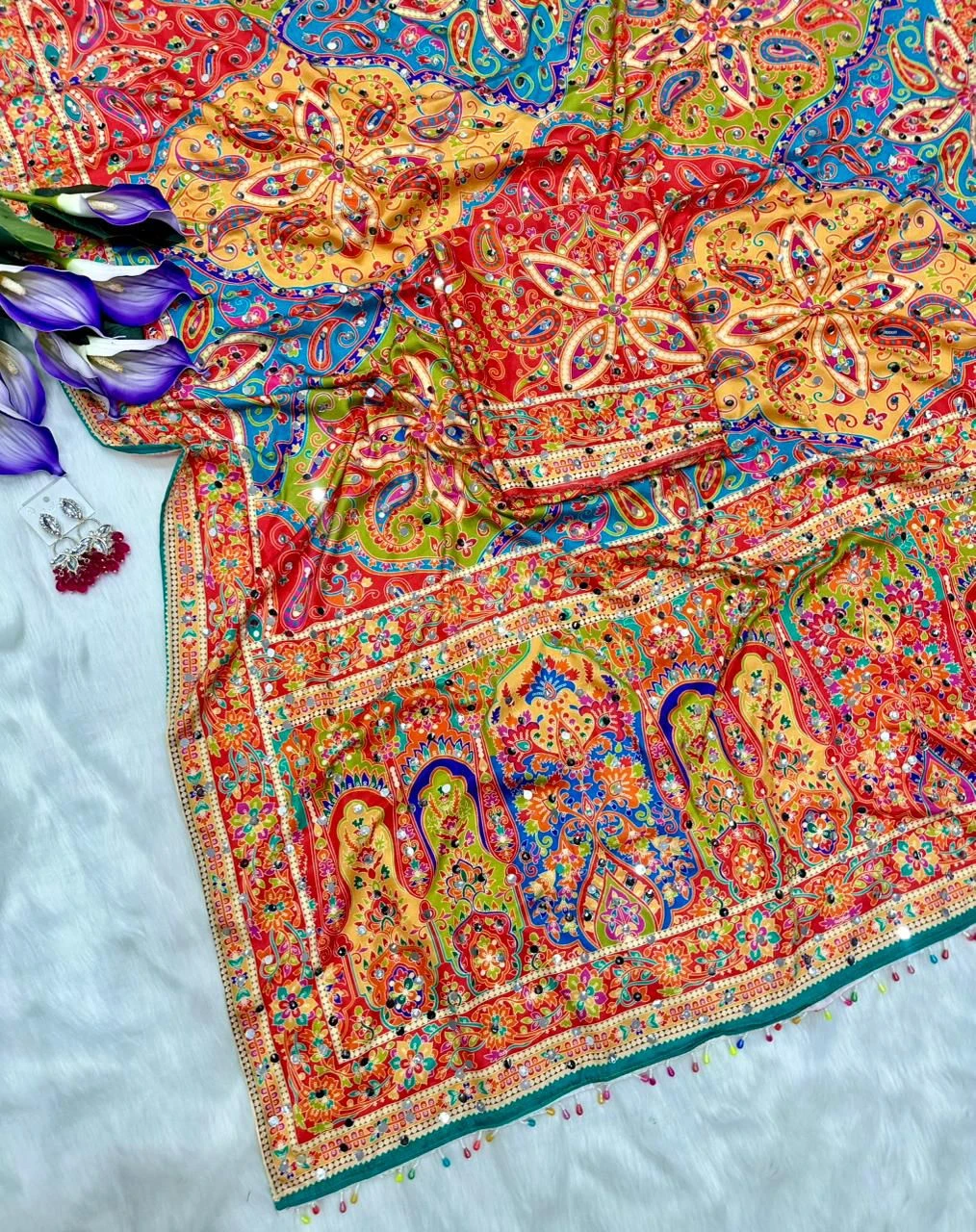 Upgrade your ethnic wardrobe with this beautiful designer saree made from premium crepe silk fabric. The saree features elegant digital prints all over with stunning real mirror work that adds a rich and stylish look. The attractive latkan border on the pallu enhances the overall beauty of the saree, making it perfect for festive occasions, parties, weddings and traditional events.