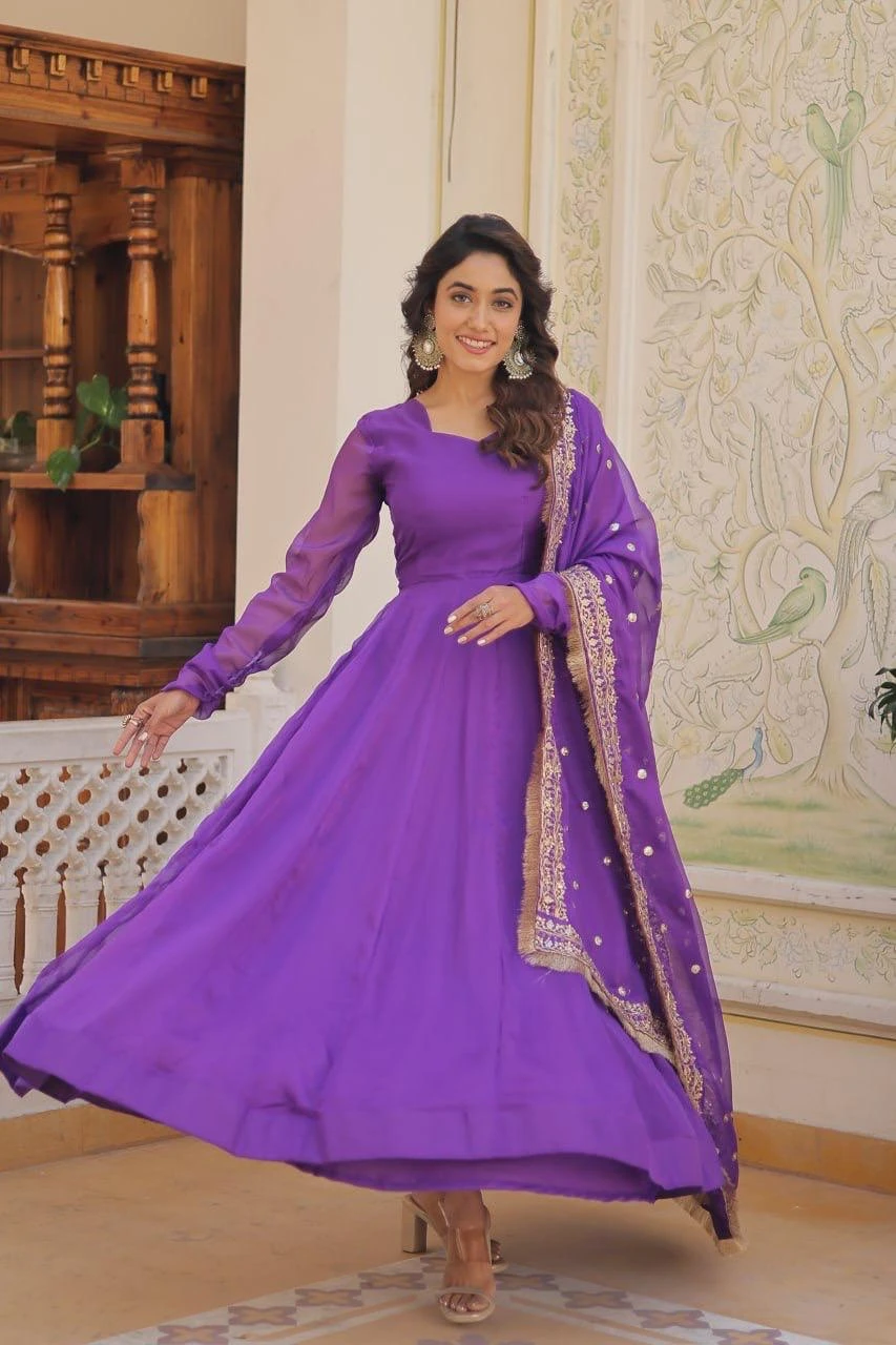Upgrade your ethnic wardrobe with this beautiful Russian Silk Gown with Dupatta, designed to give a graceful and stylish look for special occasions. This elegant gown features a grand 4-meter flair with Kali pattern stitching, which creates a stunning flow while walking. The premium Russian silk fabric with sequins embroidery work adds a luxurious and festive touch.